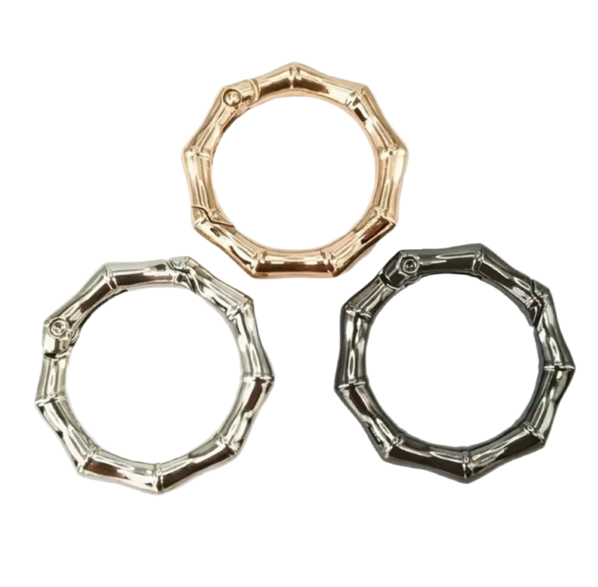 Gli anelli a moschettone con effetto bamboo sono degli anelli in metallo apribili perfetti per aggiungere un tocco di funzionalità e di stile alla realizzazione di borse fatte a mano, portachiavi, bijoux e tanti altri accessori !